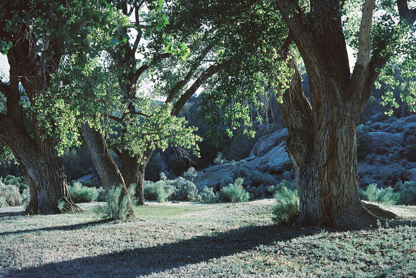 held in the arms of cottonwoods arising a potent recital of memory arising two bodies root as the place speaks of itself its breath filters through the screen we sway in its speckled light berries ripen as we chew and the music of a soul plays loud clear soft sweet